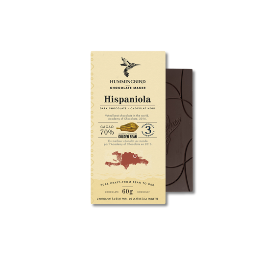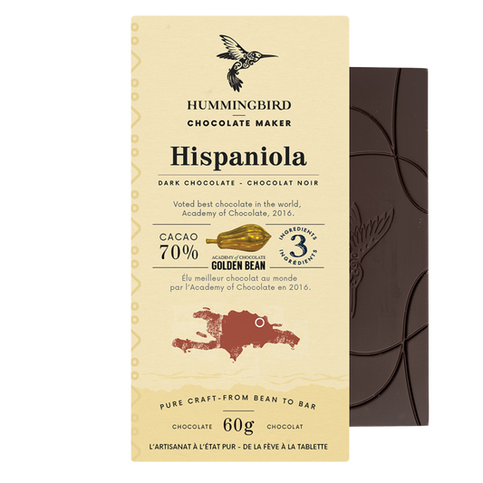 Single Origin, Dominican Republic Cacao, 70% Dark Chocolate. It's Hispaniola 70% blended with Vancouver Island...