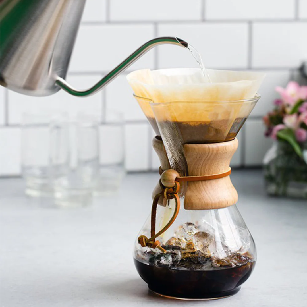 Comme toutes bonnes choses, l'arôme complet prend du temps - et votre touche personnelle. La cafetière Chemex ne fournit que les éléments essentiels à l'obtention d'un café riche en saveur afin que votre goût personnel et votre approche transparaissent. Cela comprend un collier en bois poli avec une boucle en cuir.