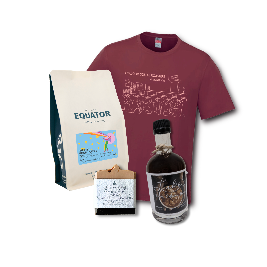Our local bundle includes a freshly roasted bag of coffee, a cotton branded t-shirt, luxurious handmade soap, and a bottle of Luke's Gingerbread syrup.